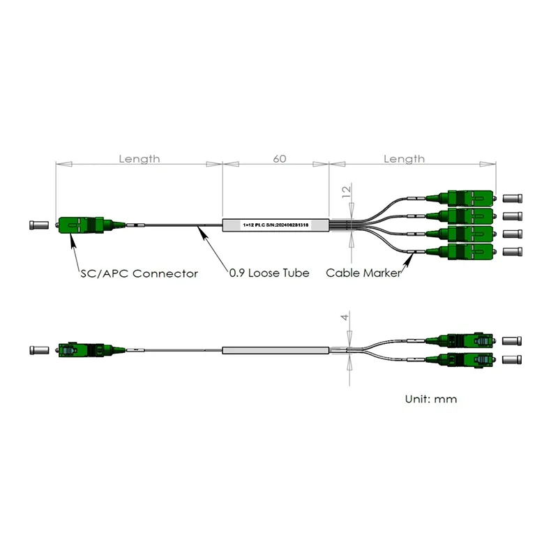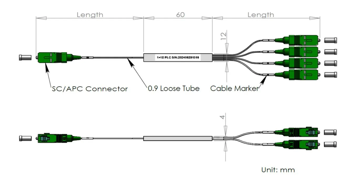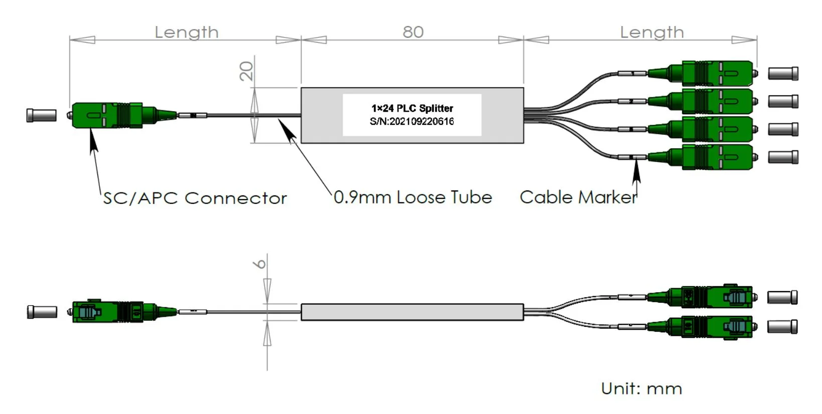 1x12/1 × 24 PLC Splitter Çelik Tüp Paketi 60x12x4 ve 80x20x4mm, 900μm gevşek tüp ile 1.0+0.1/-0m, SC/APC konektörü.