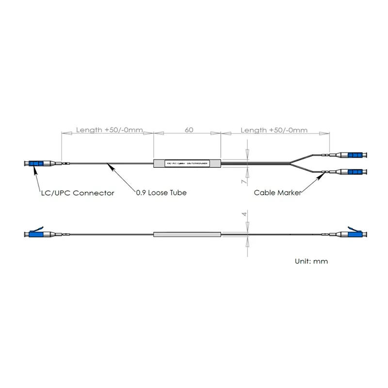 1 × 2 PLC Ayırıcı Çelik Tüp Paketi 60x7x4mm, 900μm gevşek tüp uzunluğu 1.0m, LC/UPC konnektörü.