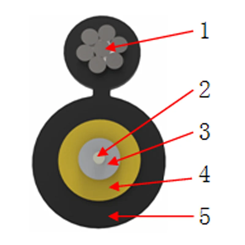 Kendi kendini destekleyen fiber optik yuvarlak damla kablo, yüksek mukavemetli aramid iplik ile kaplı sıkı tamponlu bir optik fiberden oluşur, dışa bir metal takviye elemanı tutturulur ve son olarak üzerinde bir kılıf malzemesi tabakası sıkılır.